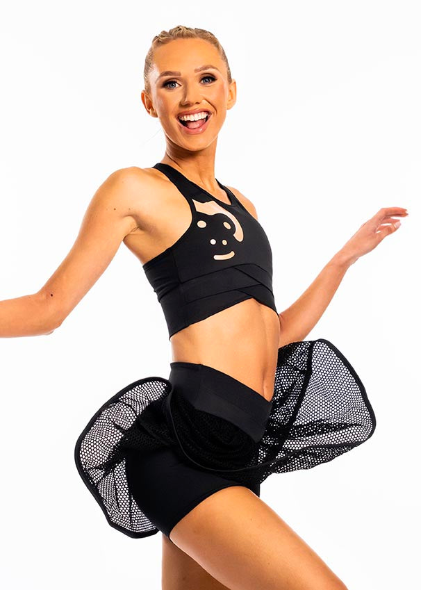 Looking for a fun and girly addition to your dance wardrobe? Look no further than our Dance Monkey Skort. The net skirt with fitted shorts underneath provides both coverage and ventilation, while the frilly design adds a playful look. The flexible material ensures a full range of motion, making this skirt perfect for dance or an active lifestyle. The V waistband provides a comfortable and secure fit. The skirt features our Monkey face logo on the back of the waistband. whether you are hitting the gym or the dance floor, our Dance Monkey Skort is the perfect choice for a fun and functional look.