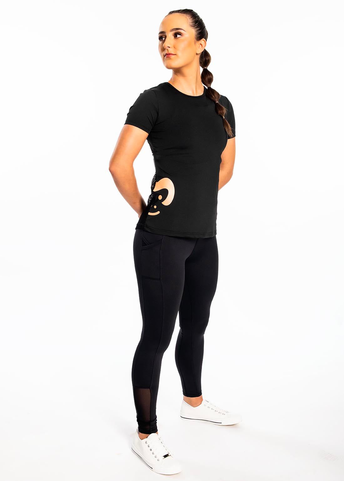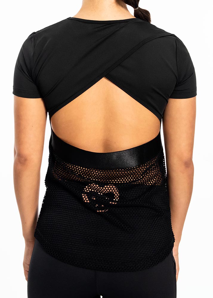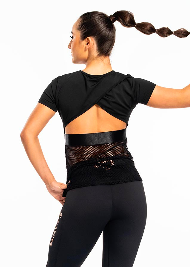 Check out our Dance Monkey T-Shirt with loose mesh back! This T-shirt features a unique cut out design at the shoulder blades that adds a touch of edginess to your look. The round neck and short sleeve design provide a comfortable fit , while the Dance Monkey logo on the side adds a touch of style. The loose net material on the back allows for maximum breathability and comfort, making it perfect for intense dance sessions.