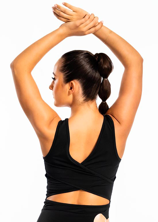 Get ready to move in our criss cross fitted vest top. This stylish top features a unique open back section that adds a touch of flair to your workout routine. The round neck provides a comfortable fit, while the logo on the side adds a touch of personality. This top is designed to fit snugly and features a criss cross design in the back that will flatter your figure. This top is perfect for any fitness or dance enthusiast.